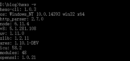输入hexo -v,检查hexo是否安装成功 ,如下: